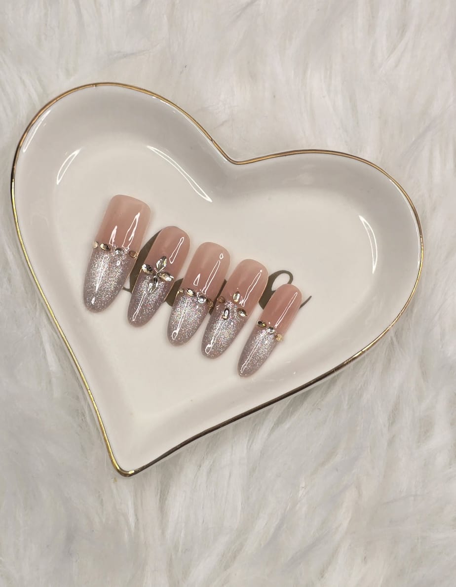 A refined nude ombré press-on nail set designed with subtle shimmer and gold crystal accents for a timeless, luxurious finish. The almond’s long shape enhances elegance while maintaining a clean and mature aesthetic.