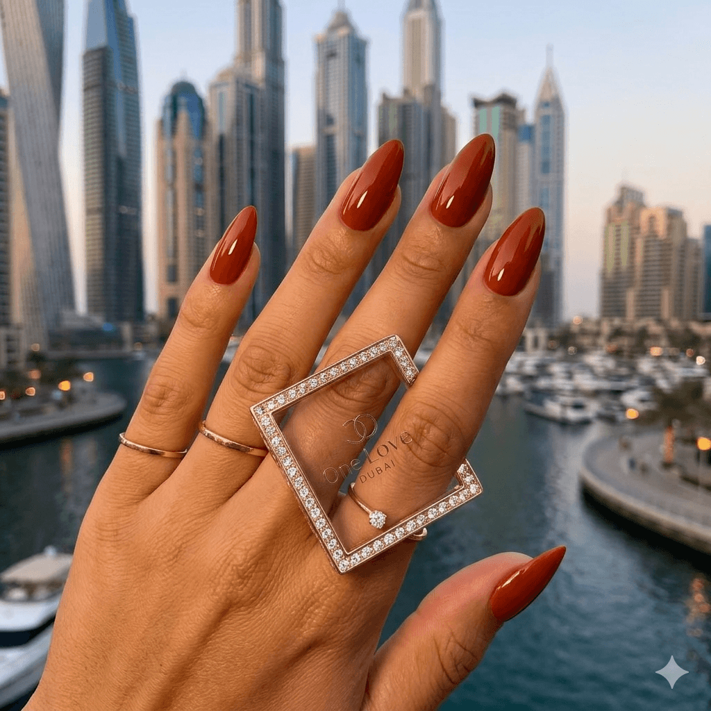 10-minute salon luxury? Deep, high-gloss burnt terracotta. Handmade with hard gel to be reusable 5+ times. No salon pain. No drills. Stop paying AED 400. Re-wearable perfection, 2-day UAE shipping.