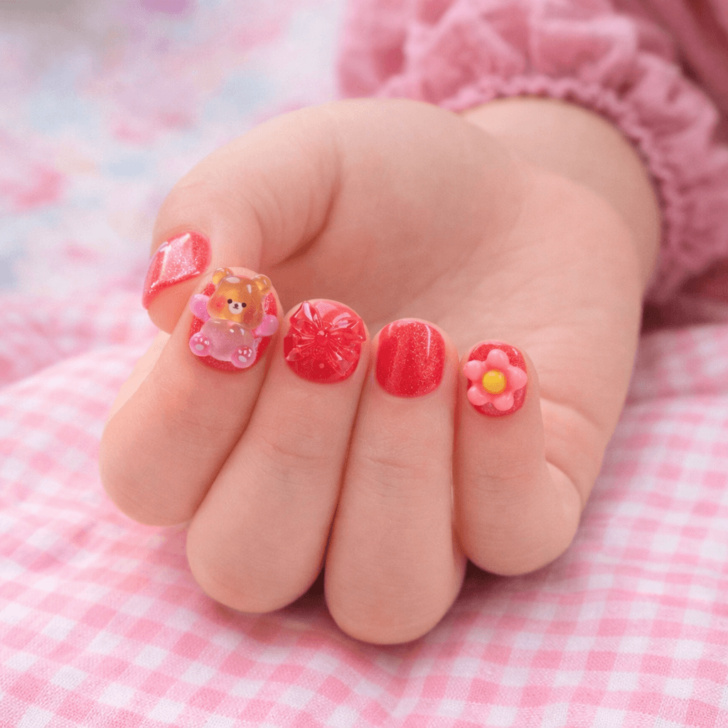 Cute kids press-on nails in a bright cherry pink color with adorable 3D bear and flower charms. Designed for little hands with a comfortable short shape. Fun, playful, and perfect for parties, birthdays, or dress-up days.
