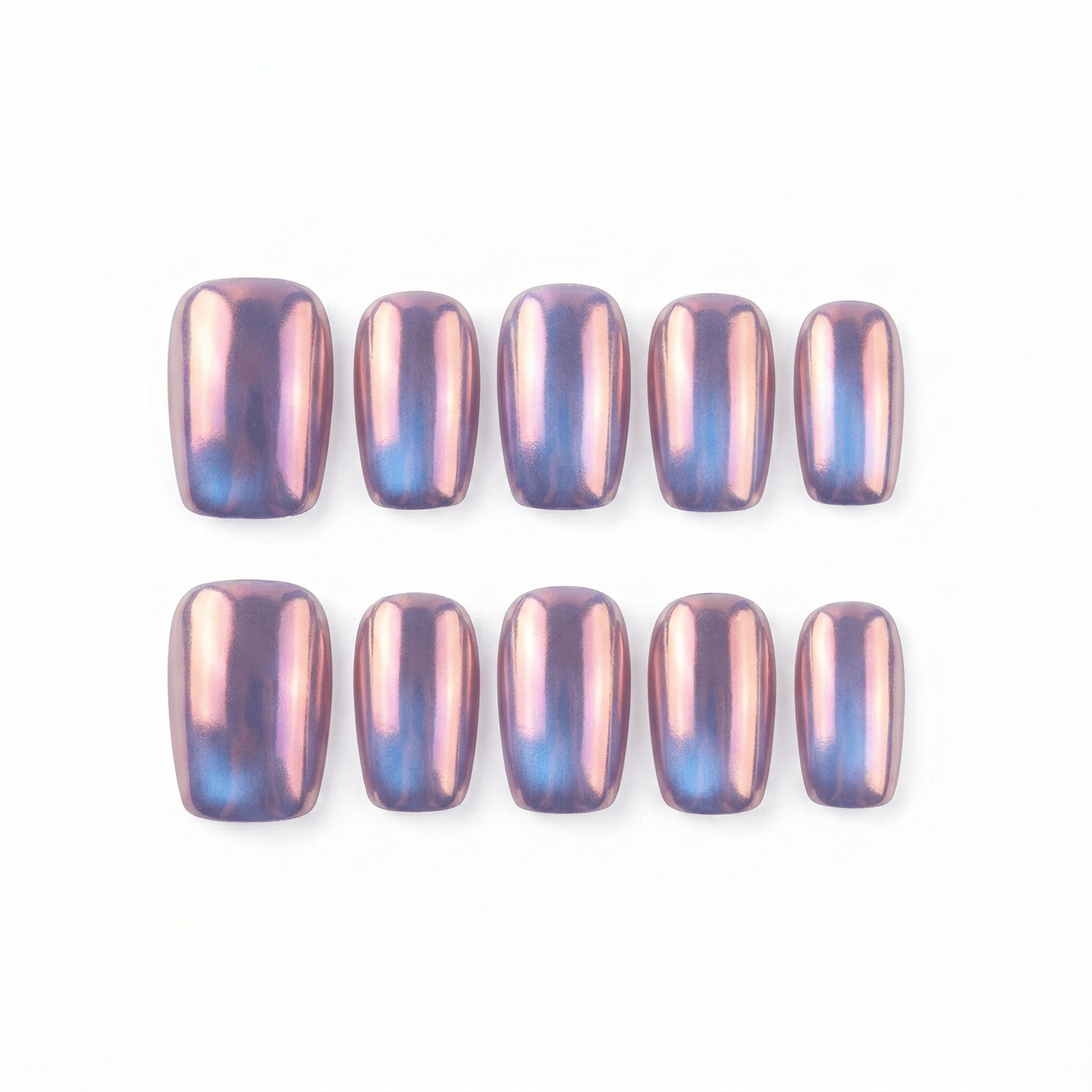 | A futuristic blend of metallic chrome with shifting pink, violet, and blue tones—this set is made to stand out. The reflective finish creates a mirror-like glow that changes with every angle, giving you a bold, high-end look instantly. Perfect for nights out, events, or when you want your nails to speak before you do. This design delivers a clean, modern luxury vibe with zero effort. ✨ High-shine chrome finish How to Use: Press. Stick. Slay. Prep: Clean your natural nails and gently push back cuticles. Size: Select the best-fitting press-on nail for each finger. Stick: Apply the adhesive tab or a small drop of glue to your natural nail. Press: Align the press-on nail and hold firmly for 15–30 seconds. Slay: You’re ready to go! Reusable and perfect for a quick style change |