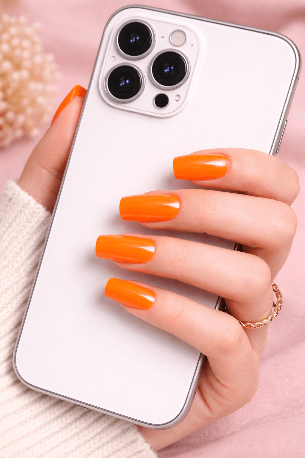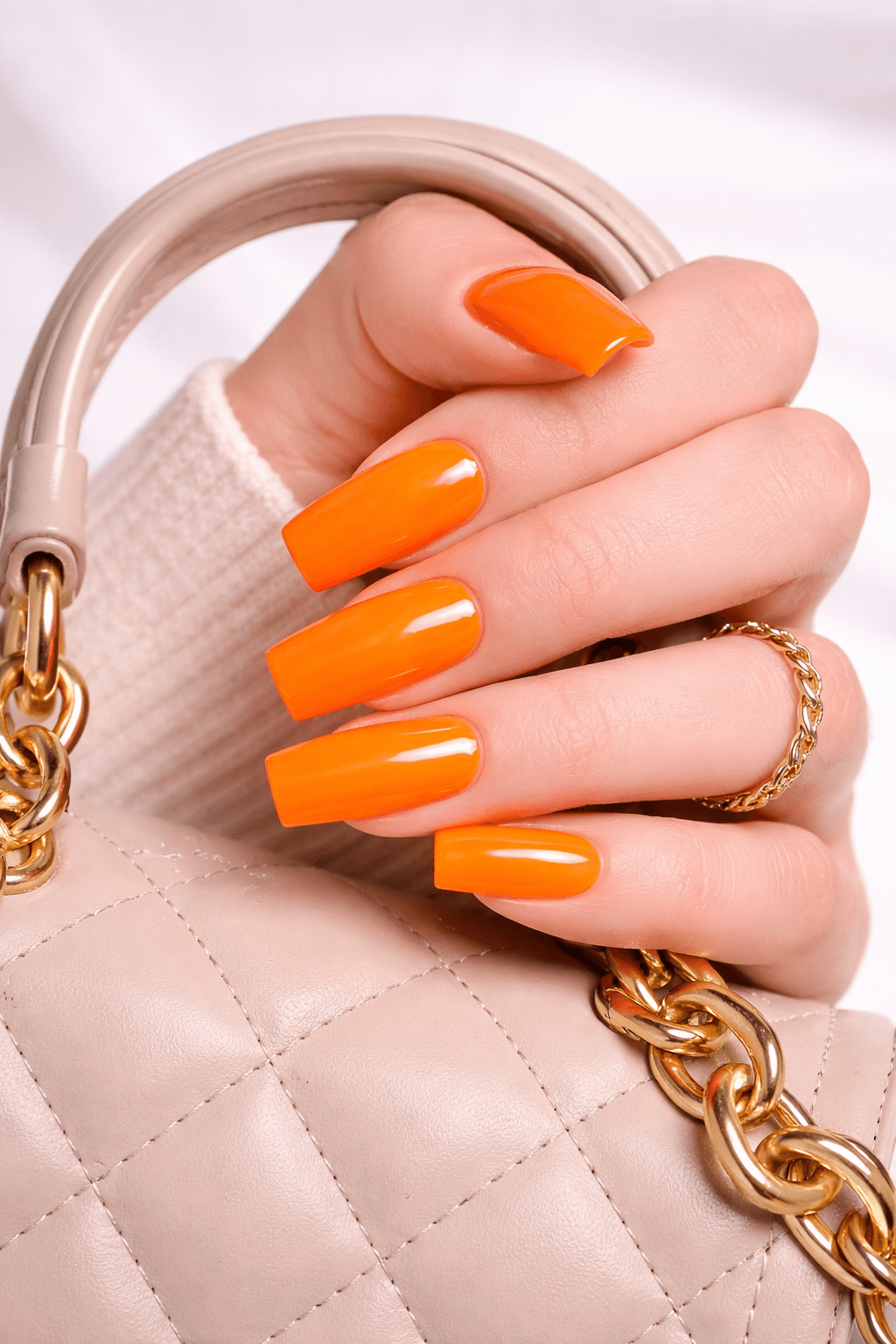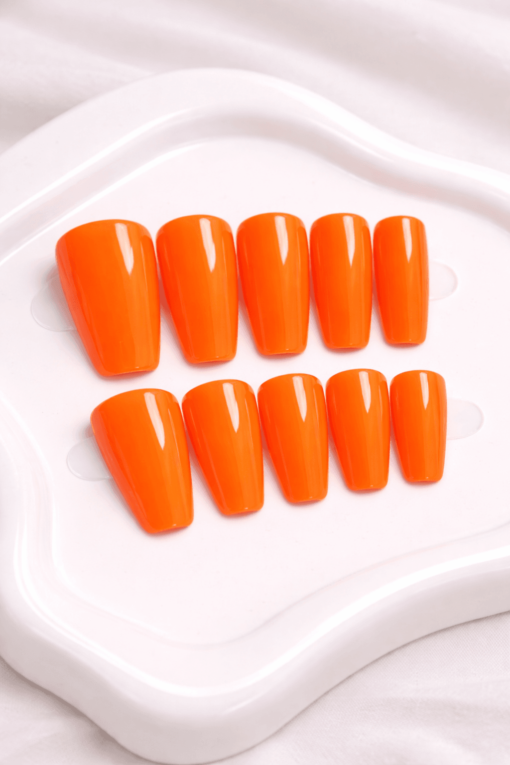 “Turn Up The Heat” is not for the faint of heart. This electric papaya orange is a high-pigment, high-energy shade that demands a second look. Hand-painted with salon-grade hard gel in a practical yet stylish square shape, these nails are built to stay flawless from the poolside to the party.