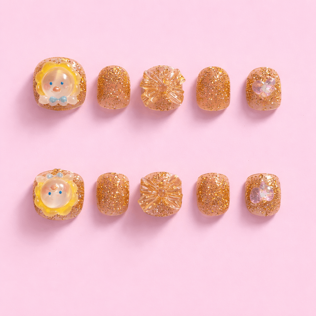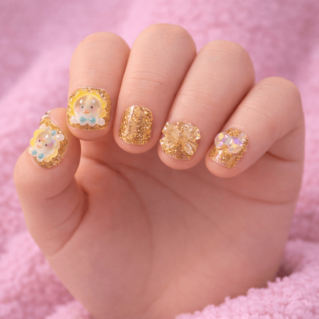 Adorable kids’ press-on nails featuring sparkling gold glitter, cute angel character charms, and shiny crystal accents. Designed in a short square shape perfect for small hands, this playful set adds a magical sparkle for birthdays, parties, and dress-up fun.
