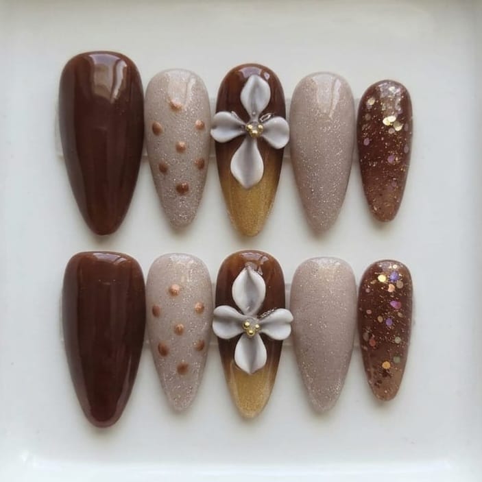 The set is elevated by a hand-sculpted 3D white flower with a gold center, perfectly paired with metallic gold foil accents and delicate polka-dot details. It’s a warm, artistic look that feels both modern and luxurious.