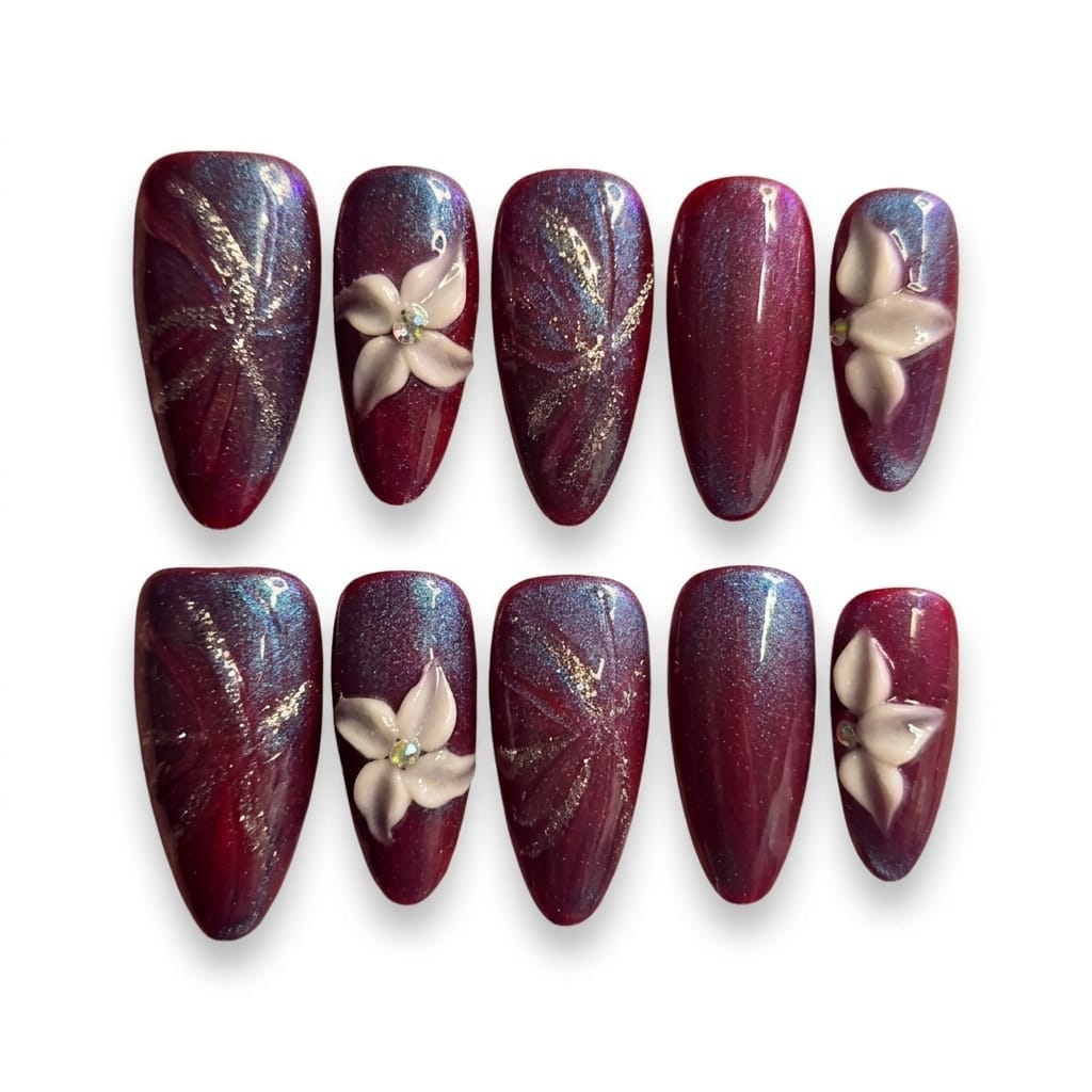 Step into the spotlight with our Midnight Orchid LUXE set. This handcrafted masterpiece features a captivating deep burgundy base with a mesmerizing blue-silver cat-eye shimmer that shifts in the light.
