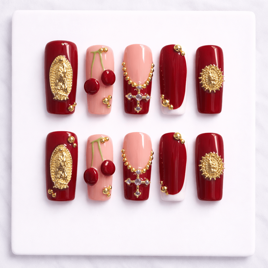Handmade 3D press-on nails featuring deep red and nude tones with gold religious charms, cherry accents, and crystal cross embellishments for a bold luxury look.