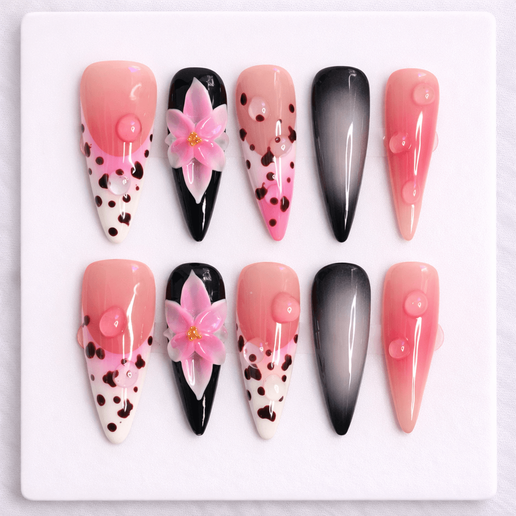 Handmade 3D press-on nails featuring pink gradients, black ombré accents, 3D flowers, glossy bubble details, and abstract spots.