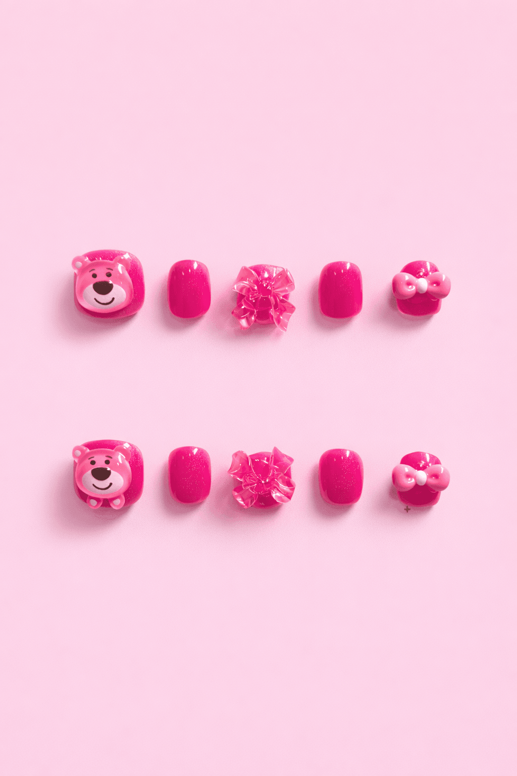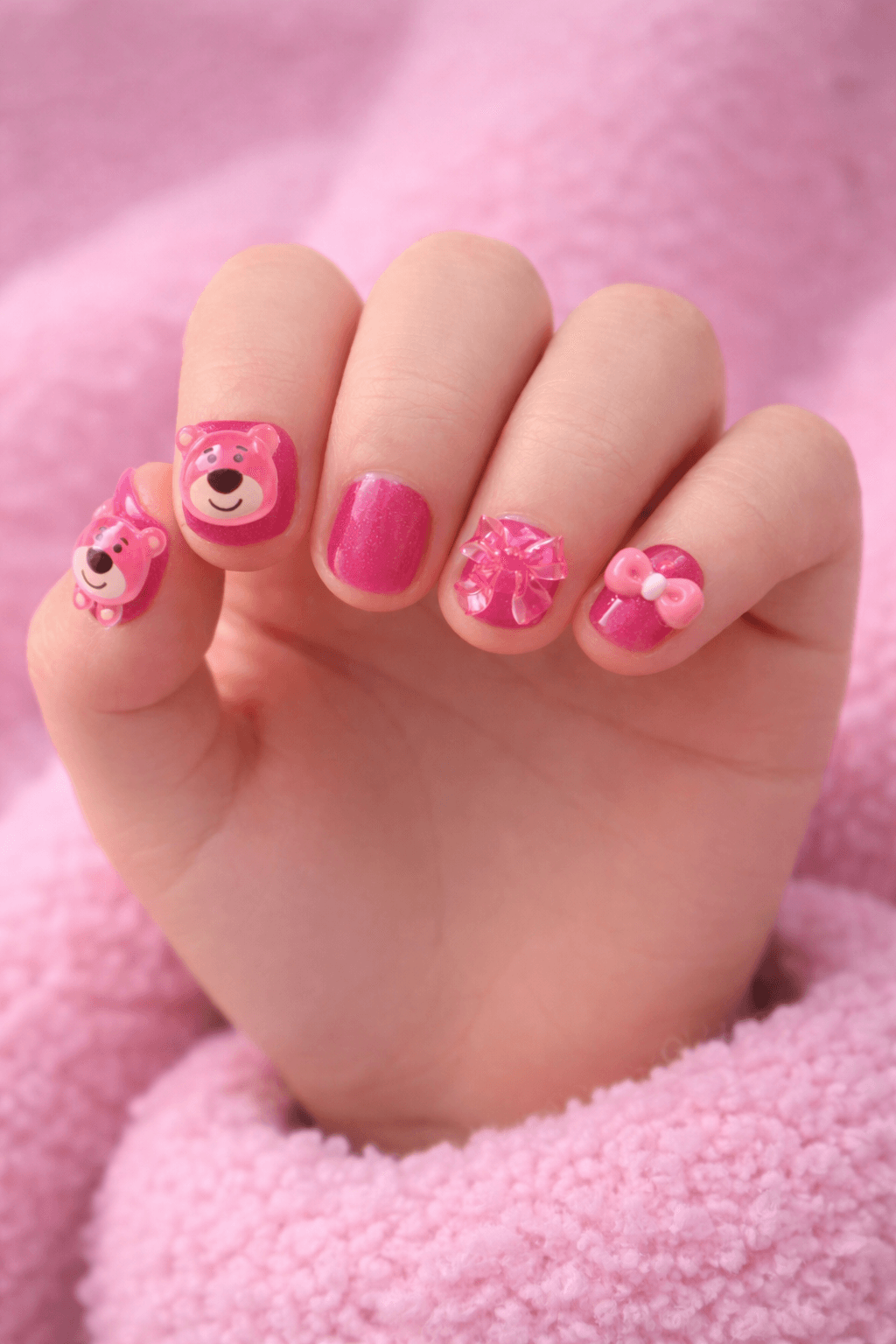 Bright pink kids press-on nails featuring a cute teddy bear charm, glossy bow accents, and sparkling pink glitter nails. Designed with a short, comfortable shape perfect for small hands. A fun and adorable nail set for parties, birthdays, and playful dress-up.