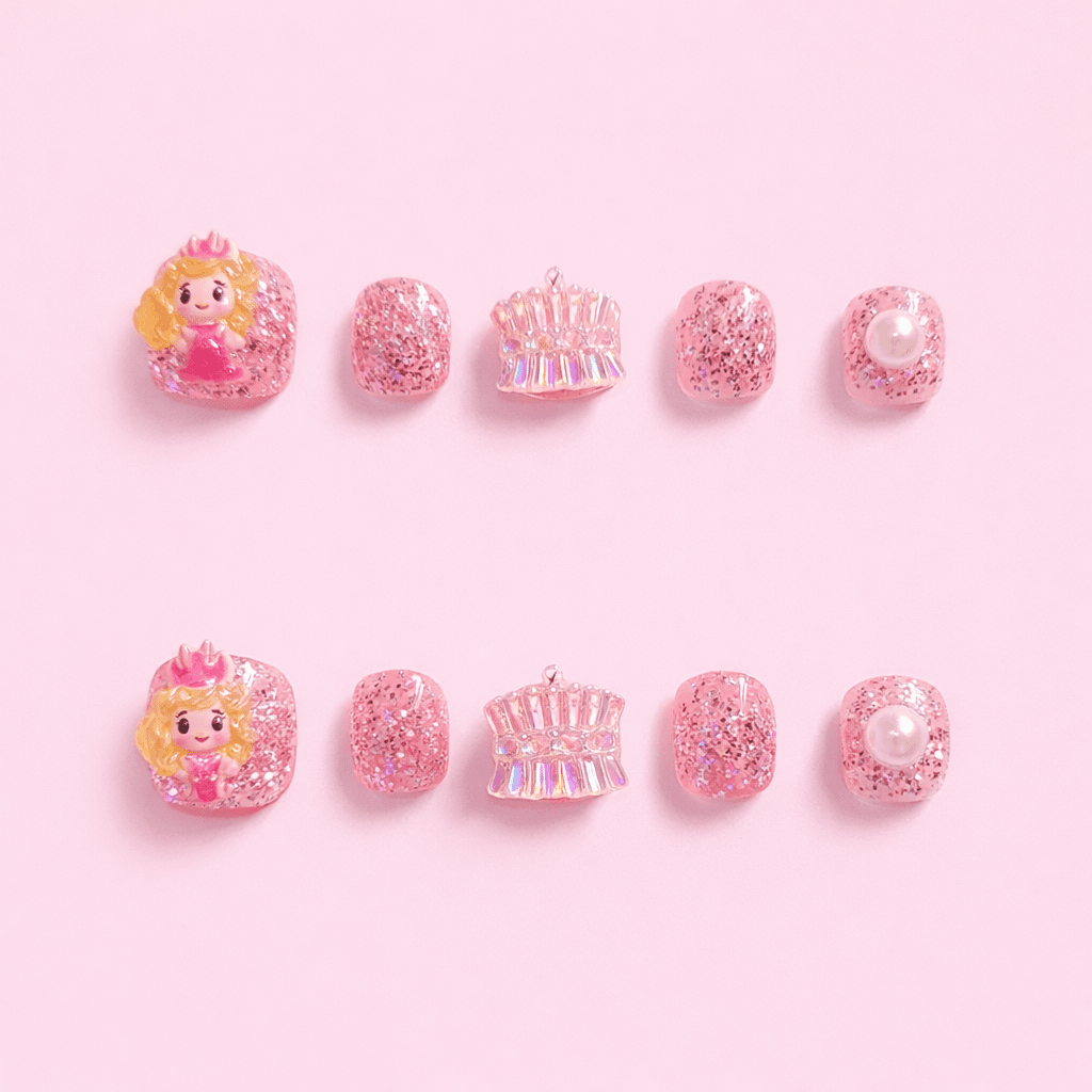 Magical pink kids press-on nails with sparkling glitter, a cute princess charm, crystal crown centerpiece, and pearl accent. Designed with a comfortable short shape for small hands. Perfect for parties, birthdays, and princess dress-up moments.