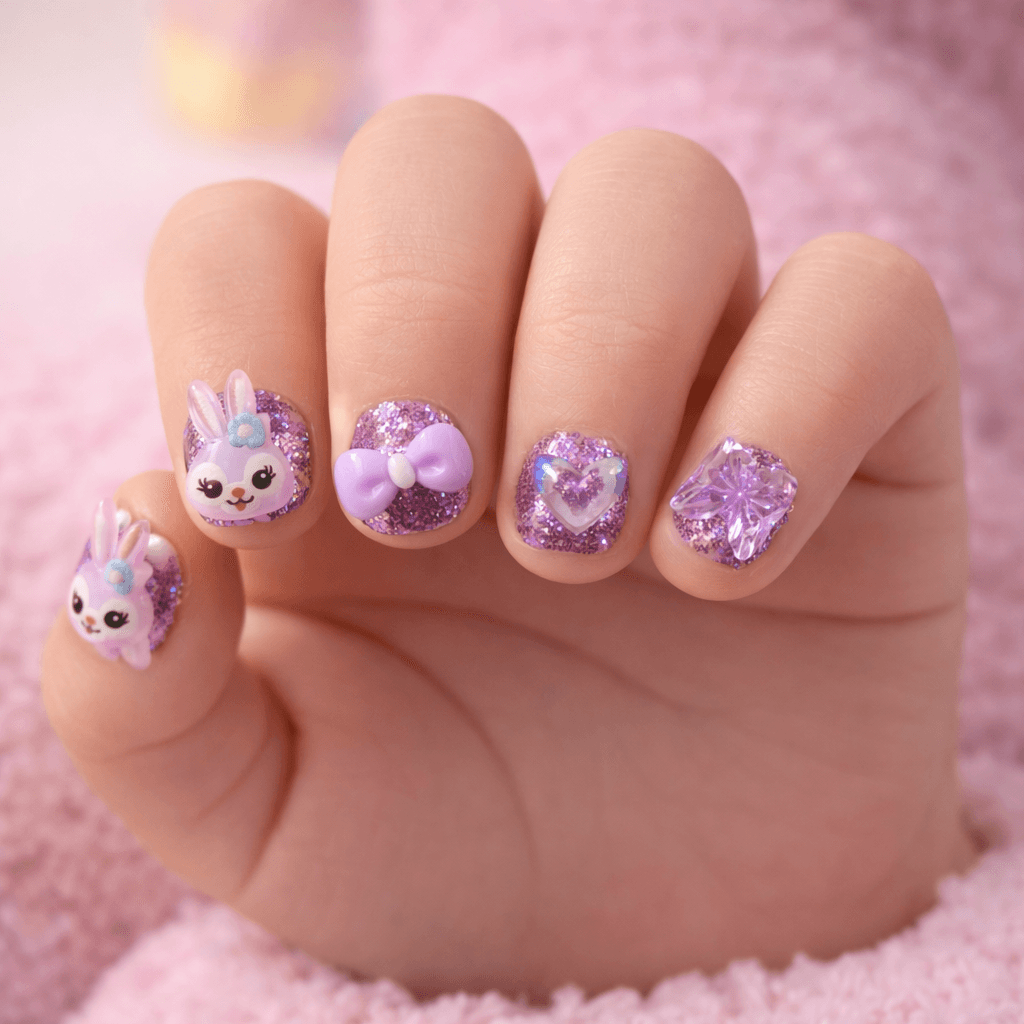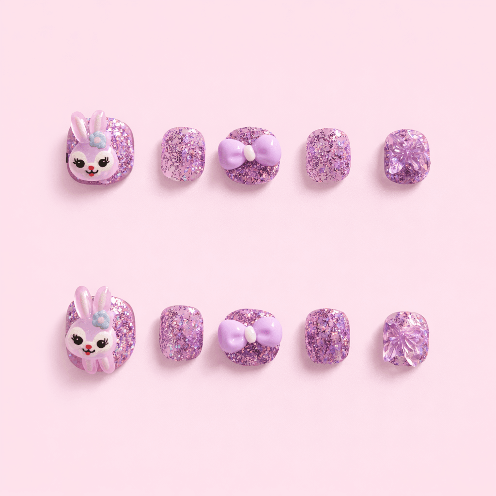 Adorable purple glitter kids press-on nails featuring a cute bunny charm, pastel bow accent, and sparkling crystal butterfly detail. Designed with a short, comfortable shape perfect for small hands. A fun and playful nail set for parties, birthdays, dress-up, and everyday cuteness.