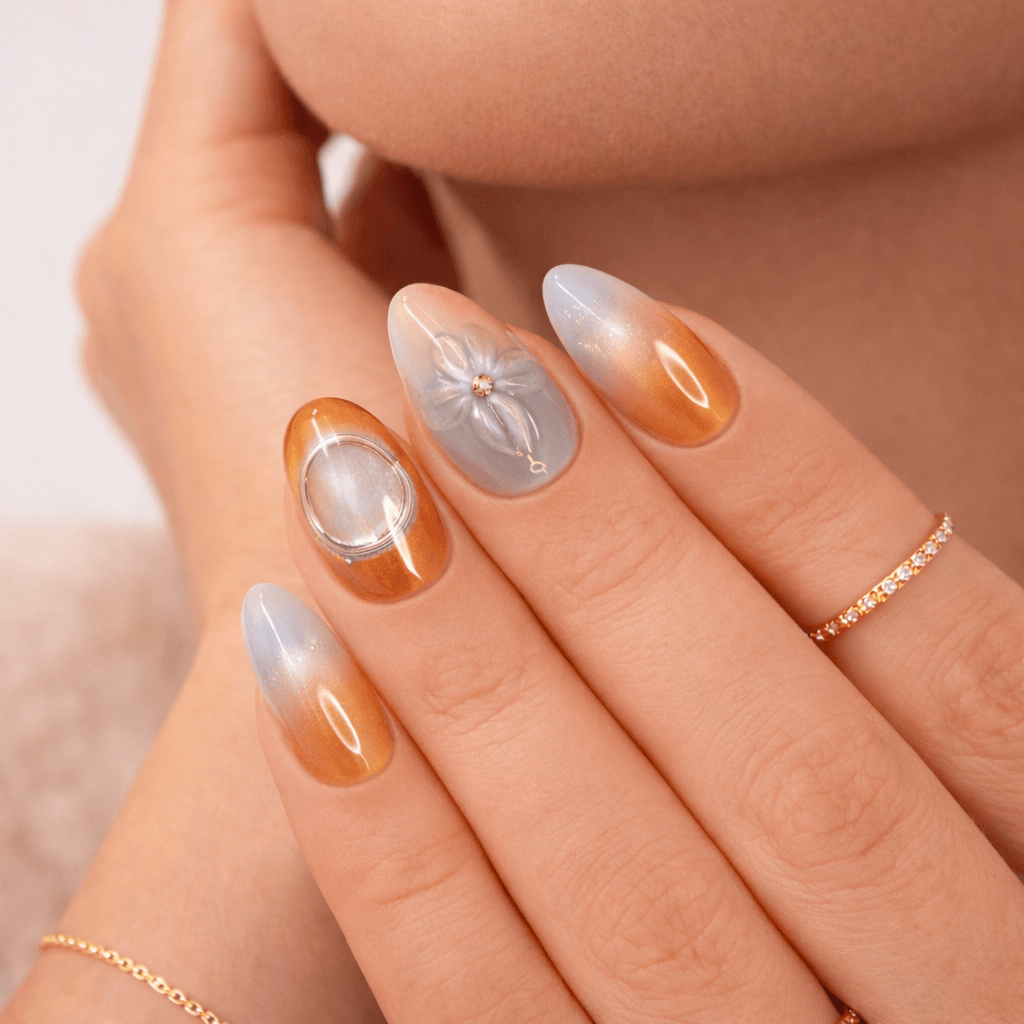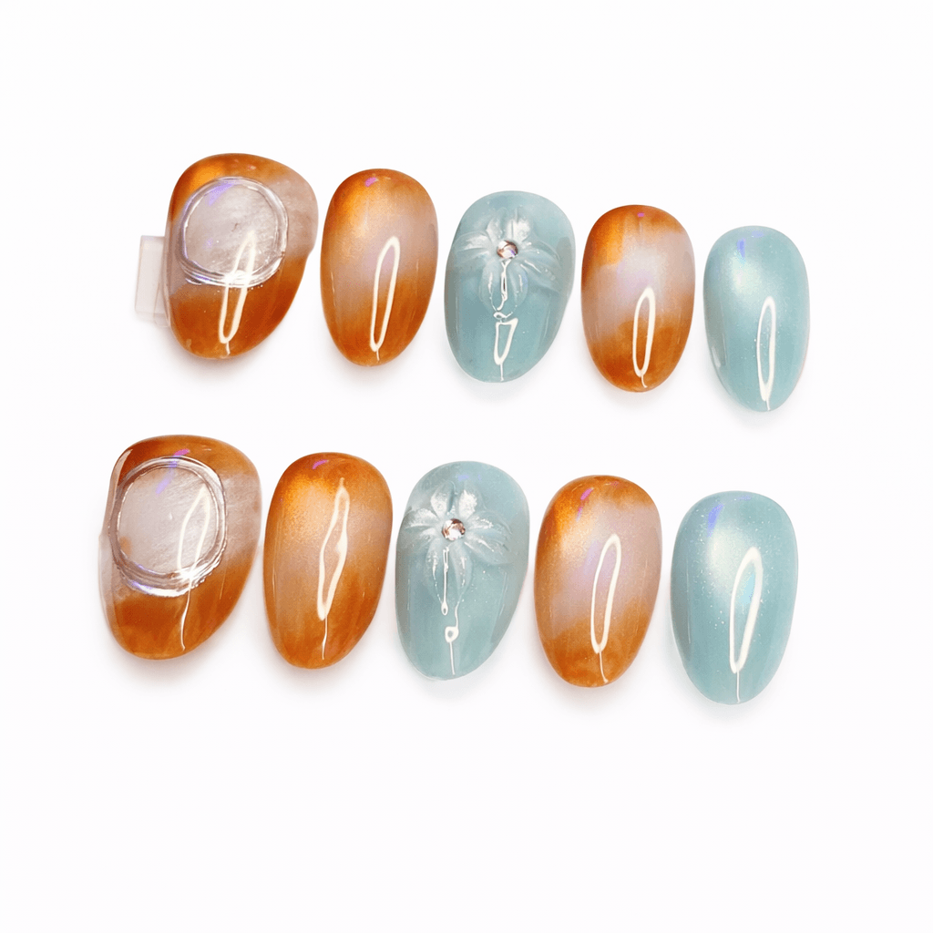 | A soft blend of sunset orange and ocean blue, this set captures the calm beauty of a fading sky. The smooth ombre transitions paired with a subtle cat-eye shimmer create a dreamy, elegant finish that feels both fresh and luxurious. Designed for women who love unique, artistic nails without being too bold—this set gives you a soft, statement look perfect for daily wear or special moments. ✨ Ombre sunset gradient How to Use: Press. Stick. Slay. Prep: Clean your natural nails and gently push back cuticles. Size: Select the best-fitting press-on nail for each finger. Stick: Apply the adhesive tab or a small drop of glue to your natural nail. Press: Align the press-on nail and hold firmly for 15–30 seconds. Slay: You’re ready to go! Reusable and perfect for a quick style change |